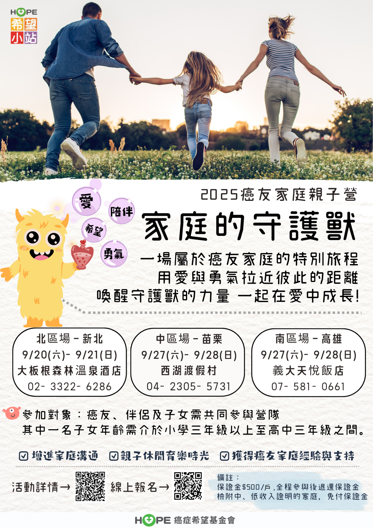 對象:確診罹癌病人、伴侶及其子女須共同參加營隊,且其中一名子女年齡介於國小三年級至高中三年級。 |