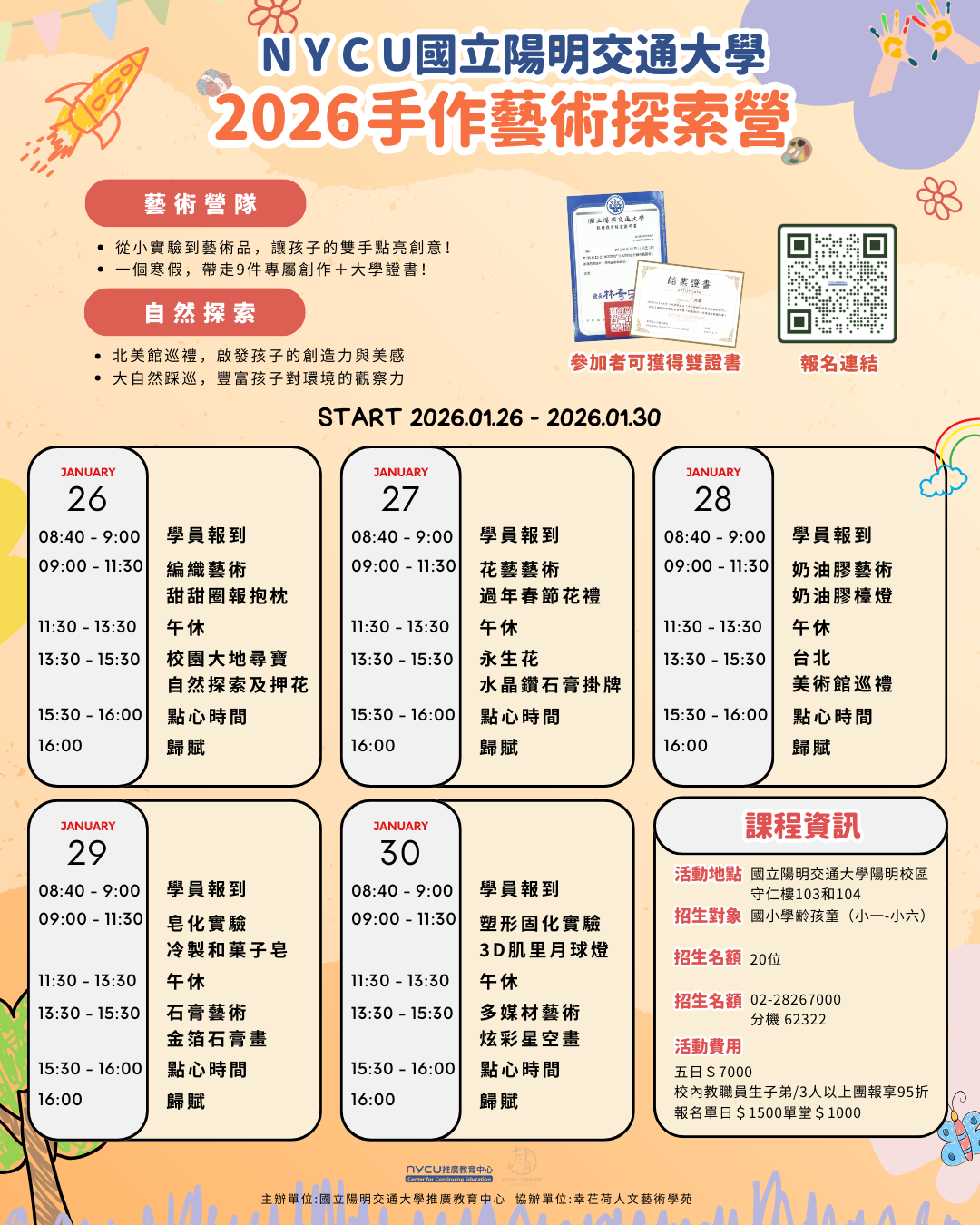 | 一、 | 本校推廣教育中心將於 115 年寒假辦理「2026 手作藝術探索營」5 日兒童課程,引導孩童探索手作藝術創作的樂趣。 |