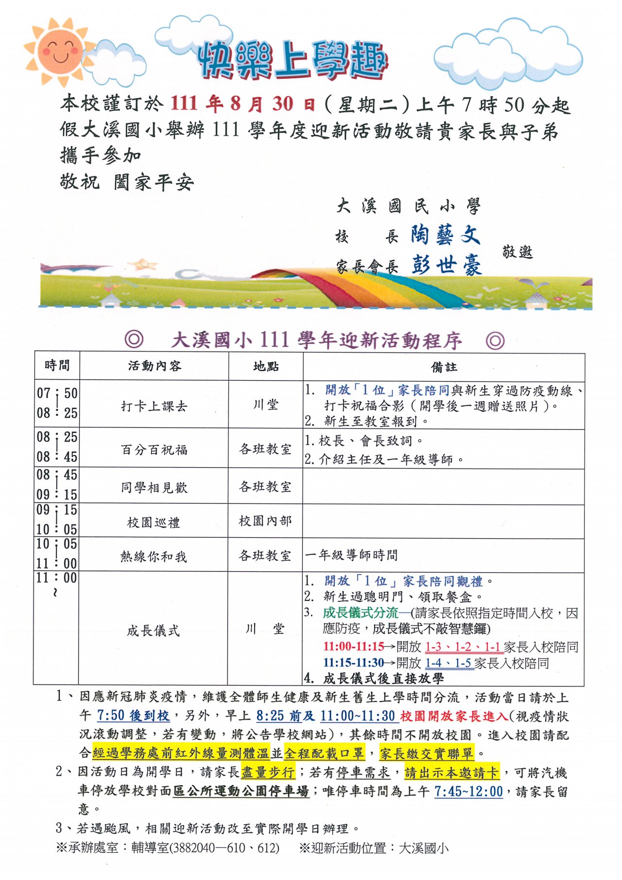 本校謹訂於111年8月30日(星期二)上午7時50分起假大溪國小舉辦111學年度迎新活動,敬請貴家長與孩子攜手參加!