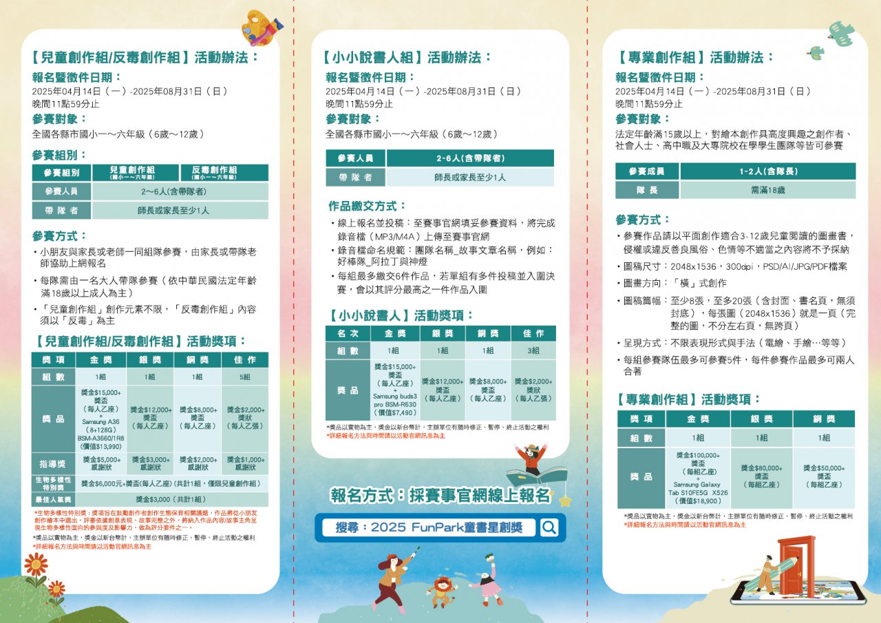 | 三、 | 本賽事徵件期間自即日起至 114 年 8 月 31 日止,一律採網路報名,報名網址: https://story.funpark.com.tw/。各組徵件對象及參賽資格說明如下: |