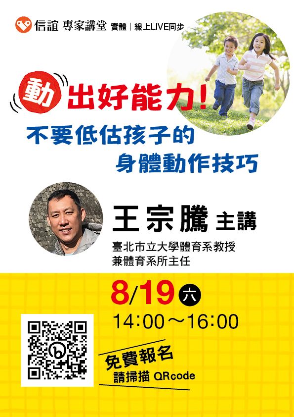 一、 | 足夠與正確的身體動作能力,不僅為孩子的好體力打底,更可以提升孩子的學習能力,是活化大腦、穩定情緒的重要途徑!信誼基金會以此為題,於 2023 年 8 月 19 日(六)舉辦【「動」出好能力!不要低估孩子的身體動作技巧】講座,本講座同時採用實體與線上課程進行,邀請爸媽及老師免費報名參加。 |