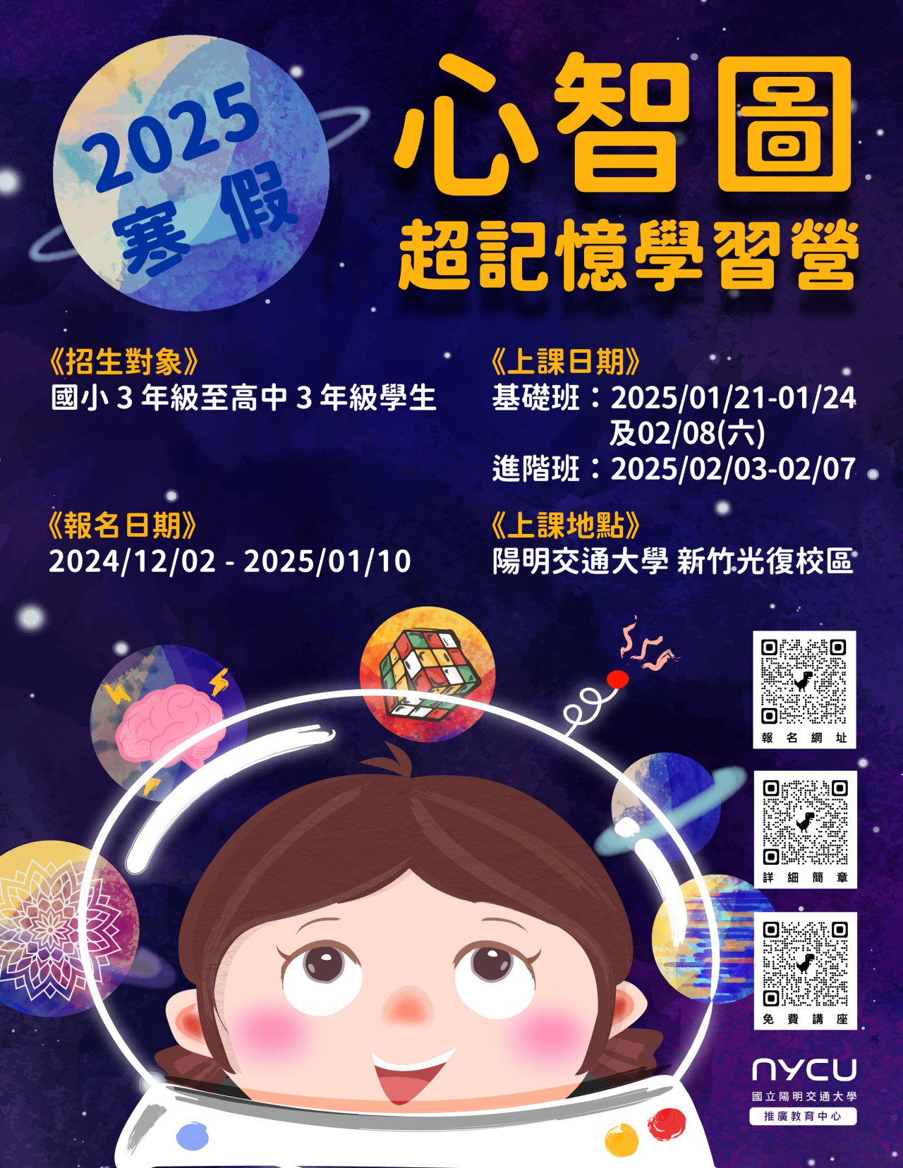 一、 | 旨揭親子免費講座(含線上)共兩梯次,時間訂於: 113 年 11 月 16 日及 12 月 29 日;營隊課程時間訂於 114 年 1 月 21 日至 2 月 8 日止。詳細課程資訊與報名繳費請至本校推廣教育中心網站: https://cec.nycu.edu.tw/Category/3 查詢。 |