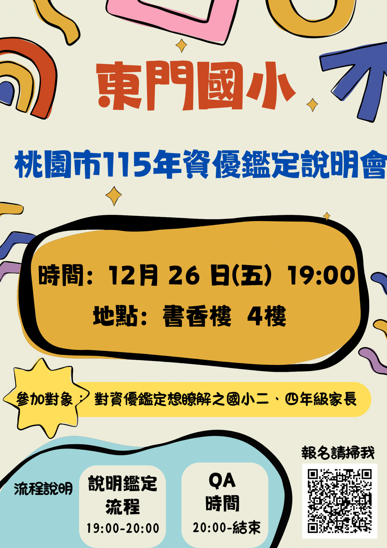 一、為使家長充分了解國小資賦優異鑑定相關程序,特舉辦此說明會,歡迎家長踴躍參加。