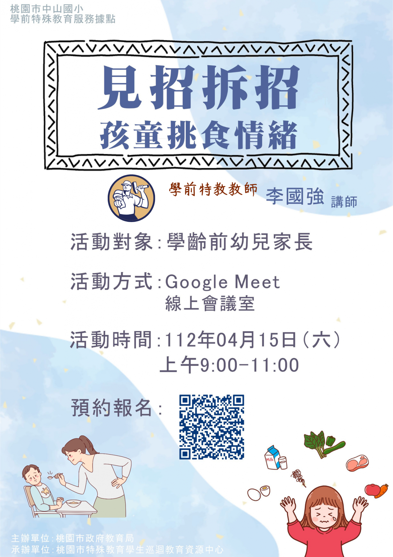為增進特殊教育幼兒早期介入之親職知能,舉辦 111 學年度中山國小學前特教服務據點線上親子講座(4 月場次),主題為「見招拆招-孩童挑食情緒」,訊息如下: |