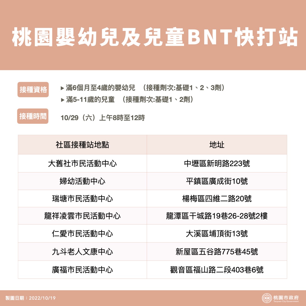 為持續提升桃園市嬰幼兒及兒童(6個月~4歲及5~11歲)之集體保護力,市府於這週10/29(六)上午仍持續開設社區疫苗接種站。