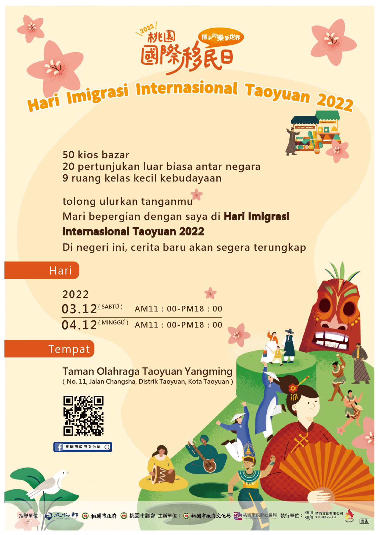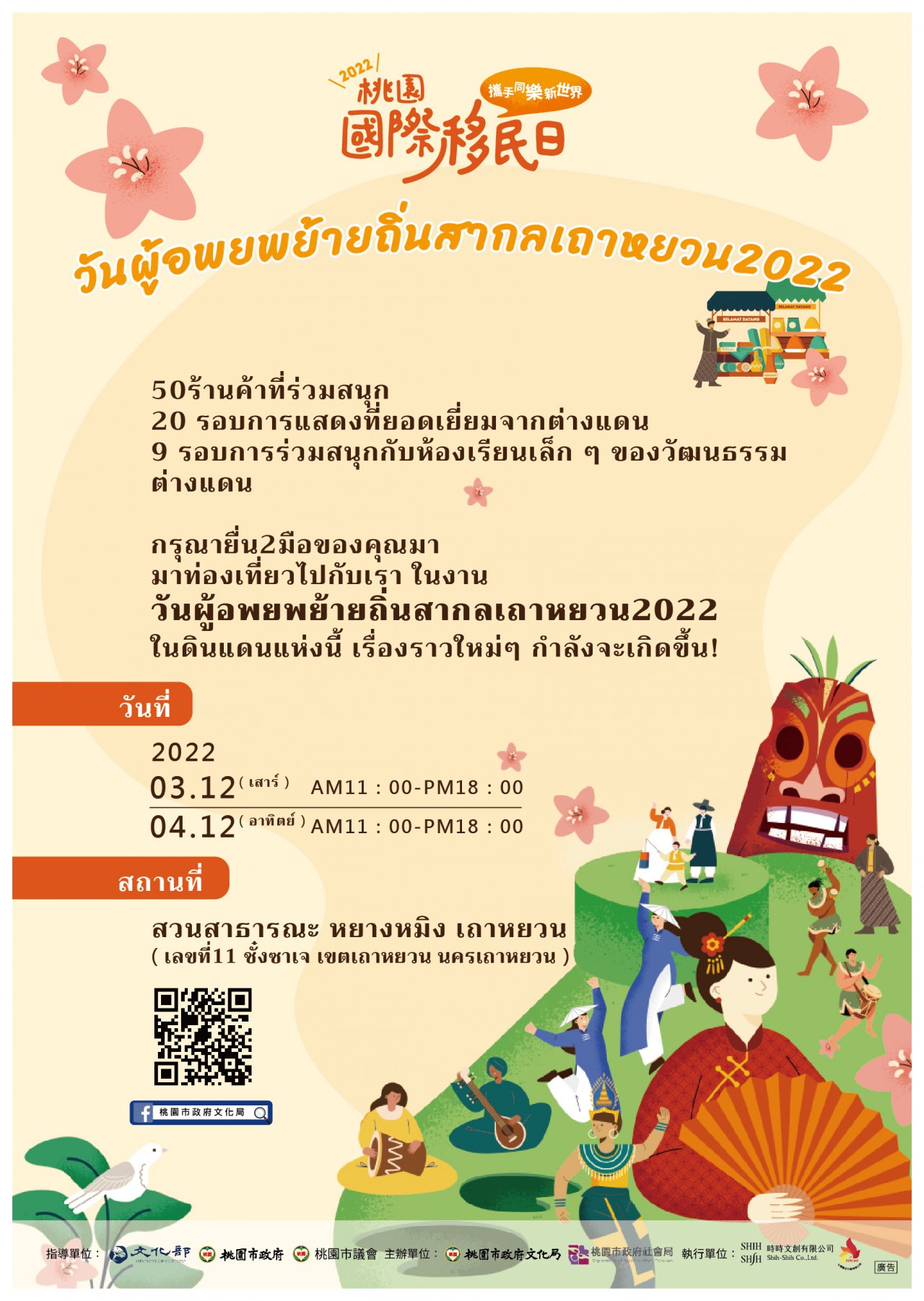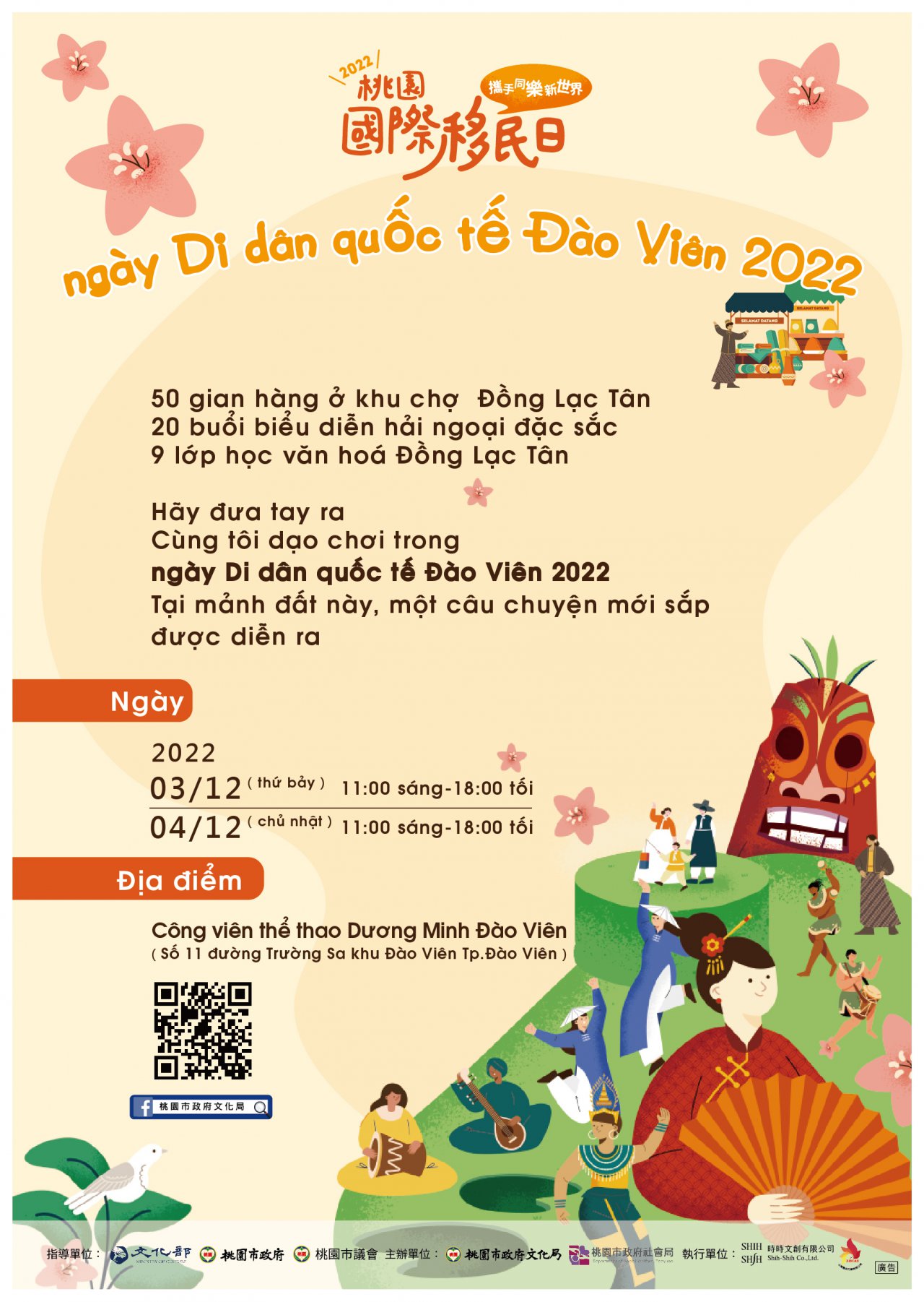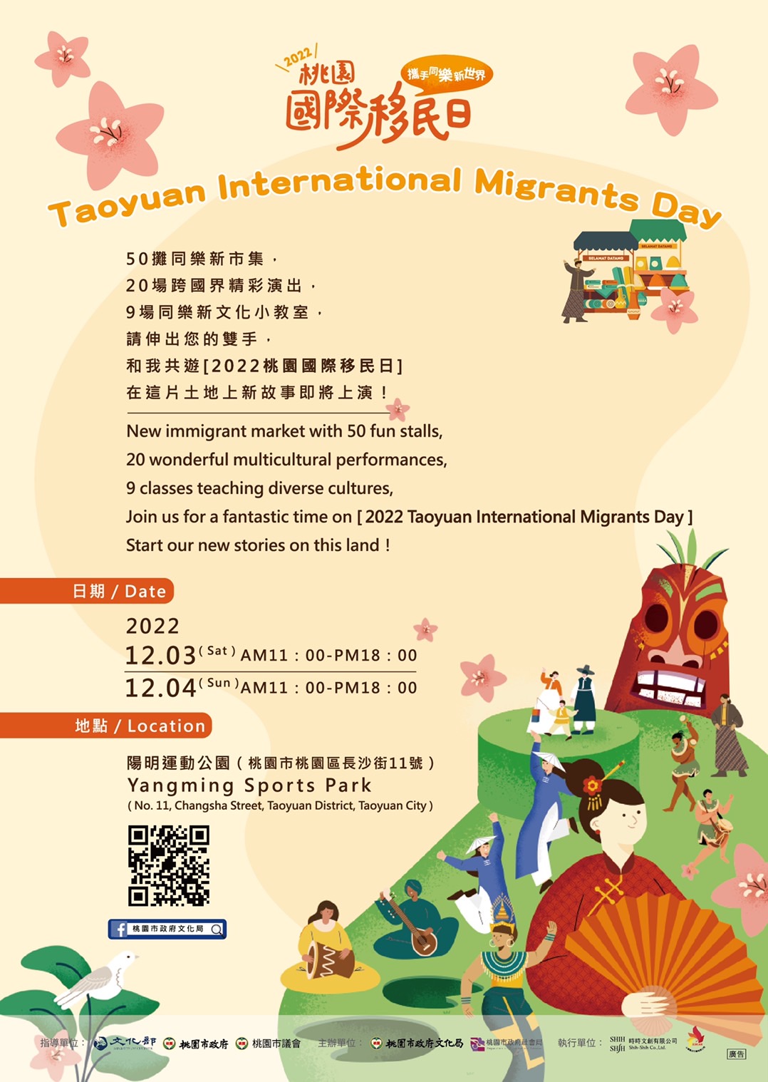 本局因應新住民人口成長,致力推動文化平權,於 111 年 12 月 3 日至 4 日於桃園區陽明運動公園辦理「2022 桃園國際移民日」活動,共計 16 場國際性與在地特色兼具的精采演出, 4 場新住民參與其中的主題劇場, 9 場異國文化的互動小教室,還有 40 攤異國 chill 市集,打造桃園成為多元文化共融的友善宜居城市。