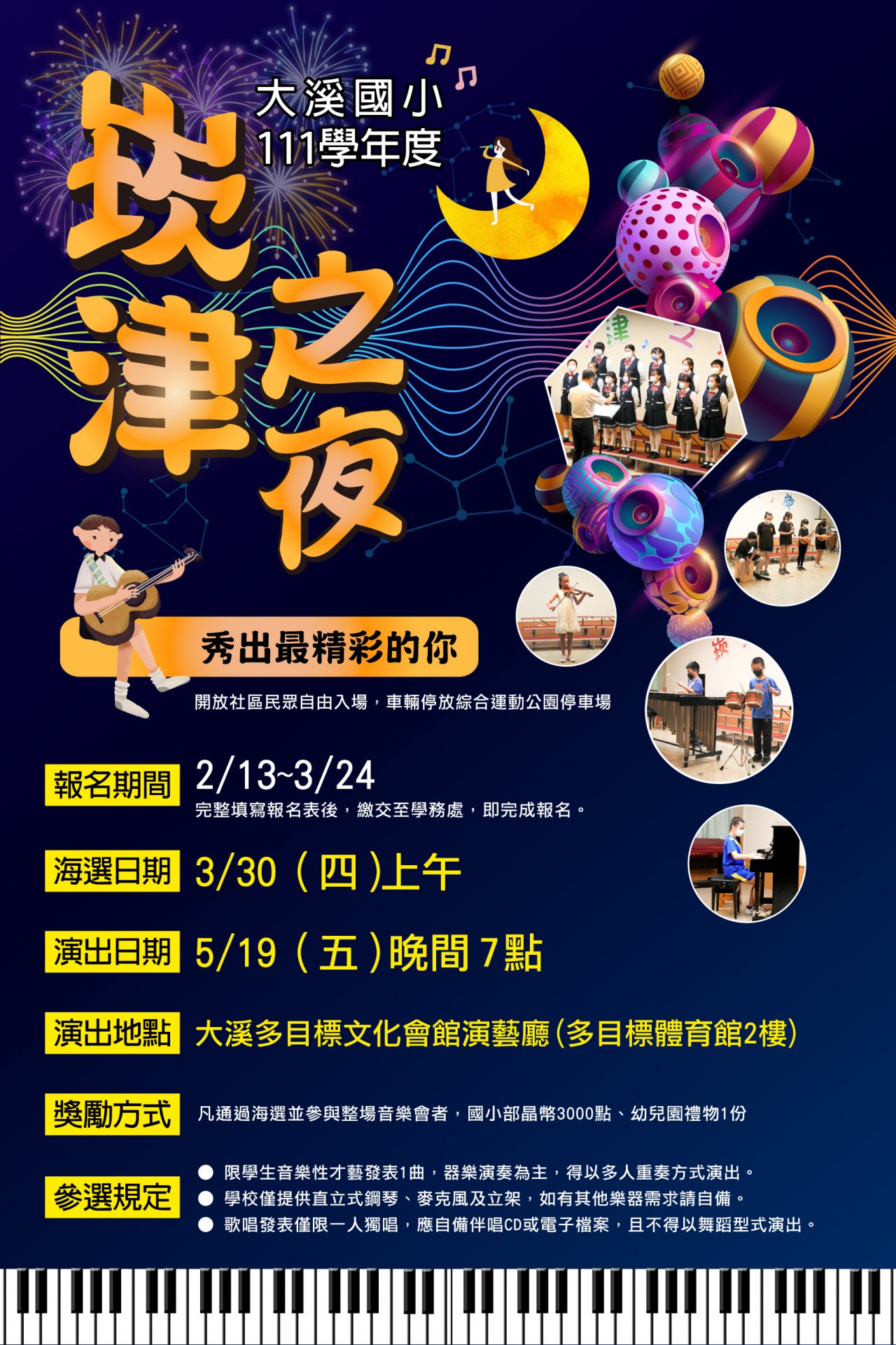 111 學年度崁津之夜將於 2 月 13 日開始報名,請家長鼓勵孩子踴躍報名、展現自己。活動相關期程如下: