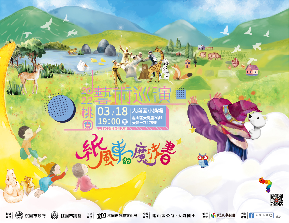 旨案預定於 111 年 3 月 18 日(星期五)晚間 7 點假龜山區大崗國小操場(龜山區大崗里 20 鄰大湖一路 175 號)辦理紙風車劇團《紙風車的魔法書》戲劇演出。