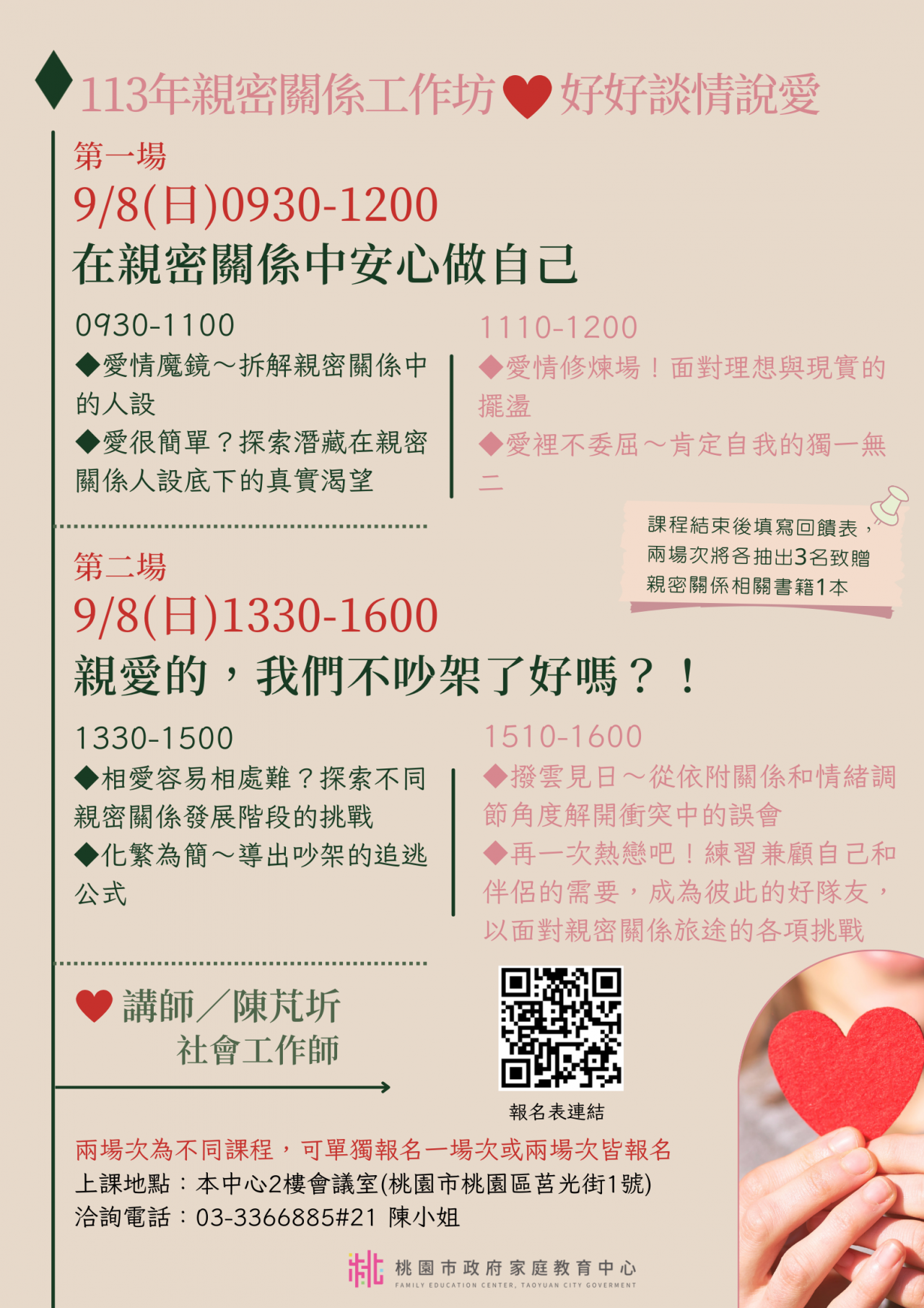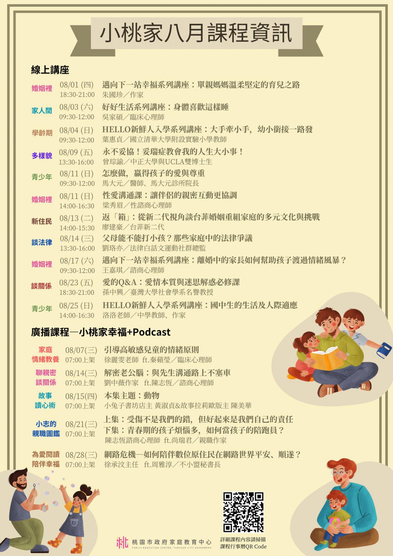 課程詳如附件,也請參考中心課程行事曆( https://reurl.cc/xlGyGL )或追蹤「桃園市政府家庭教育中心」FB 粉絲專頁;另倘有家庭教育個別化服務需求,可撥打 4128185 諮詢專線或申請小桃家線上諮詢室( https://reurl.cc/oZWOY5 )服務。