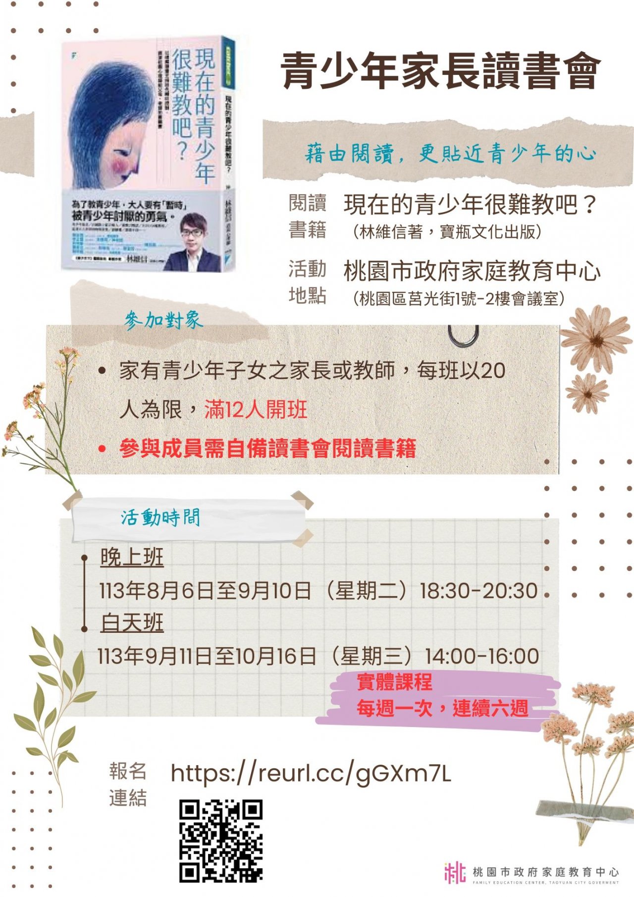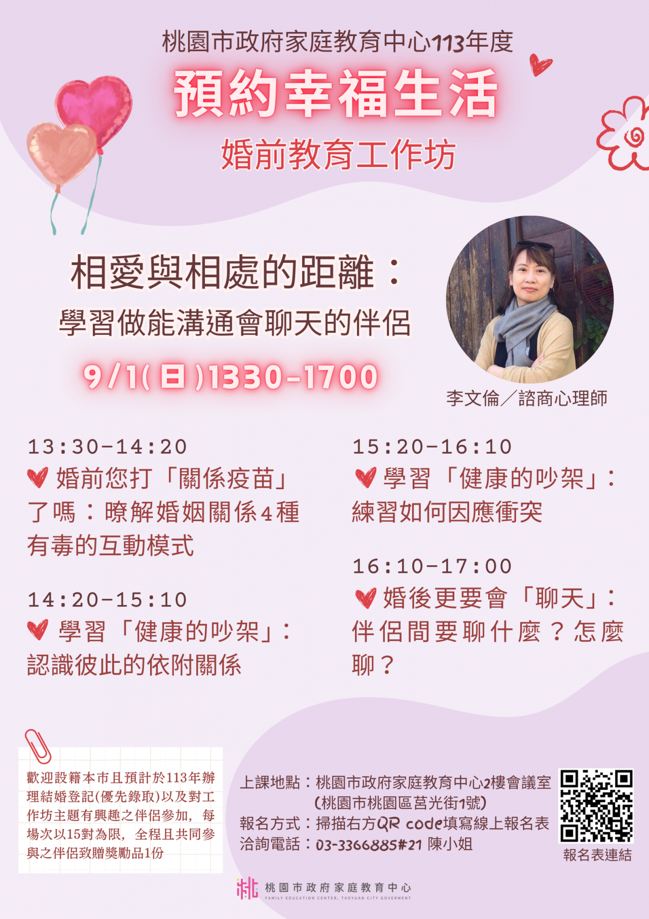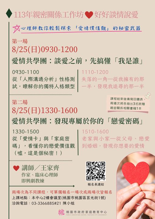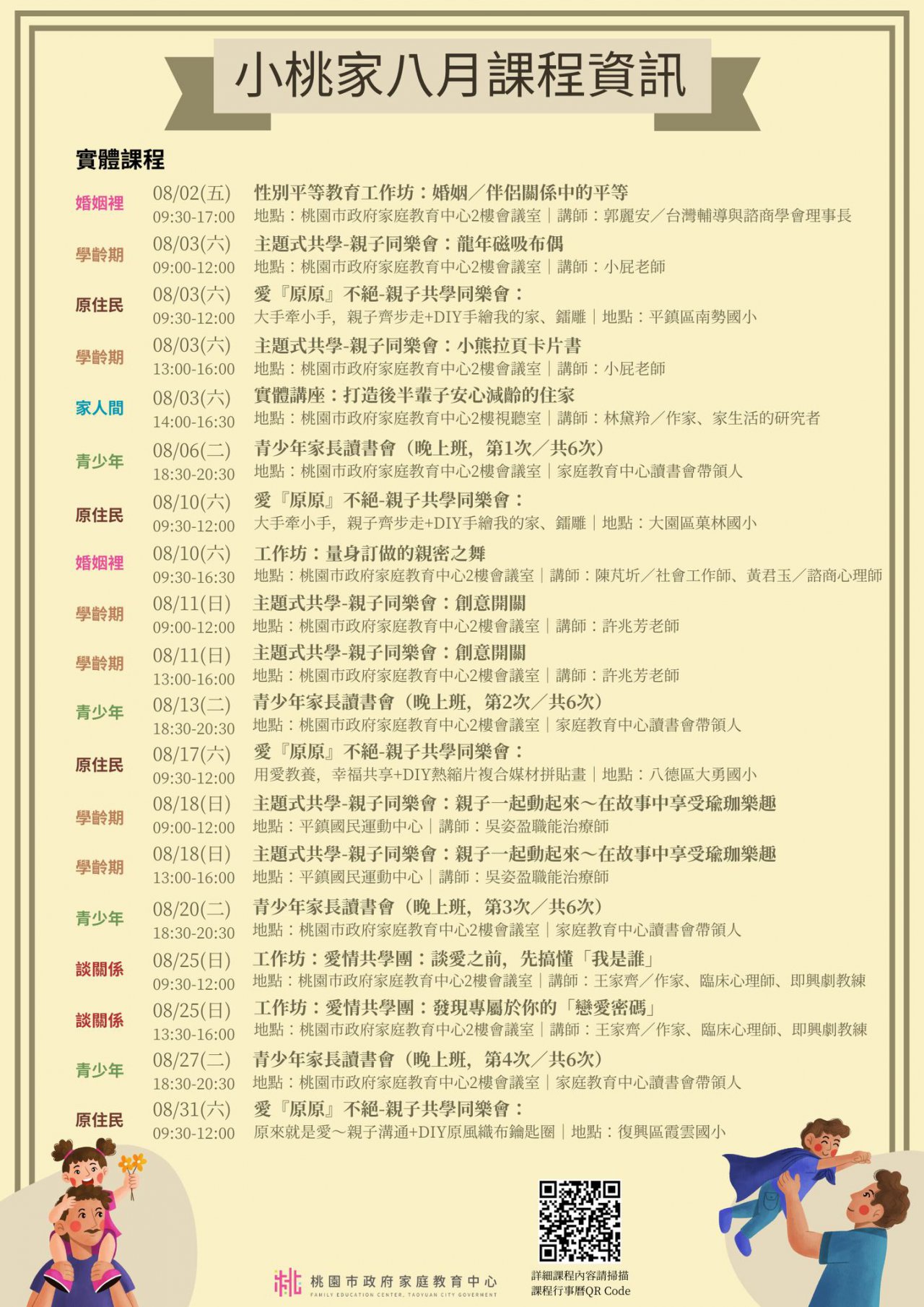 課程詳如附件,也請參考中心課程行事曆( https://reurl.cc/xlGyGL )或追蹤「桃園市政府家庭教育中心」FB 粉絲專頁;另倘有家庭教育個別化服務需求,可撥打 4128185 諮詢專線或申請小桃家線上諮詢室( https://reurl.cc/oZWOY5 )服務。