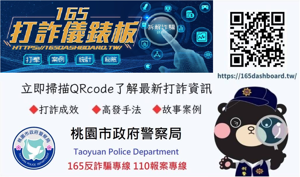 | 二、 | 為強化防詐意識,提升政府打擊詐欺犯罪透明度,並落實「新世代打擊詐欺策略行動綱領 2.0」宣導教育面向,內政部警政署業推出「165 打詐儀錶板」專網,請配合協助宣導、推廣。 |