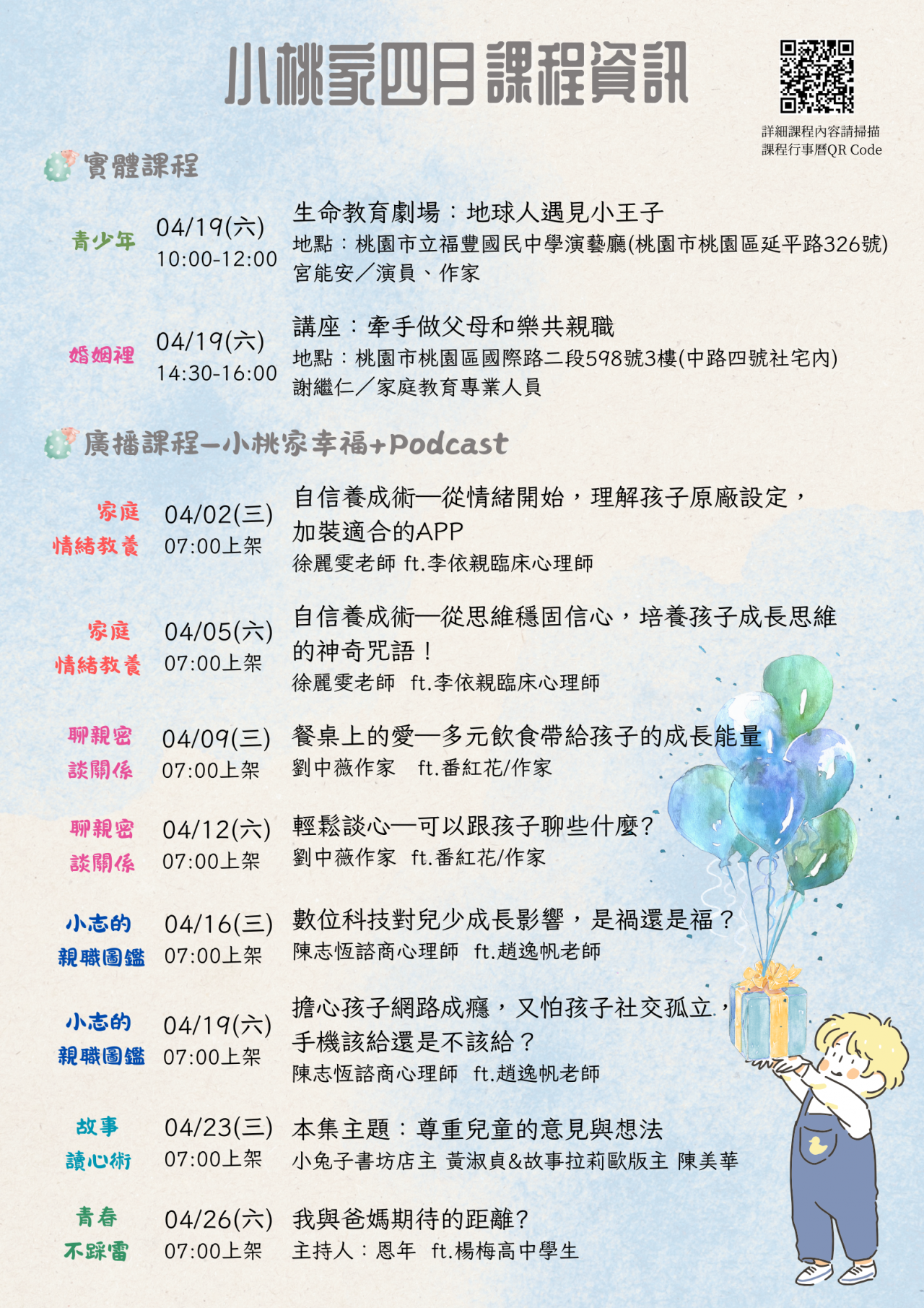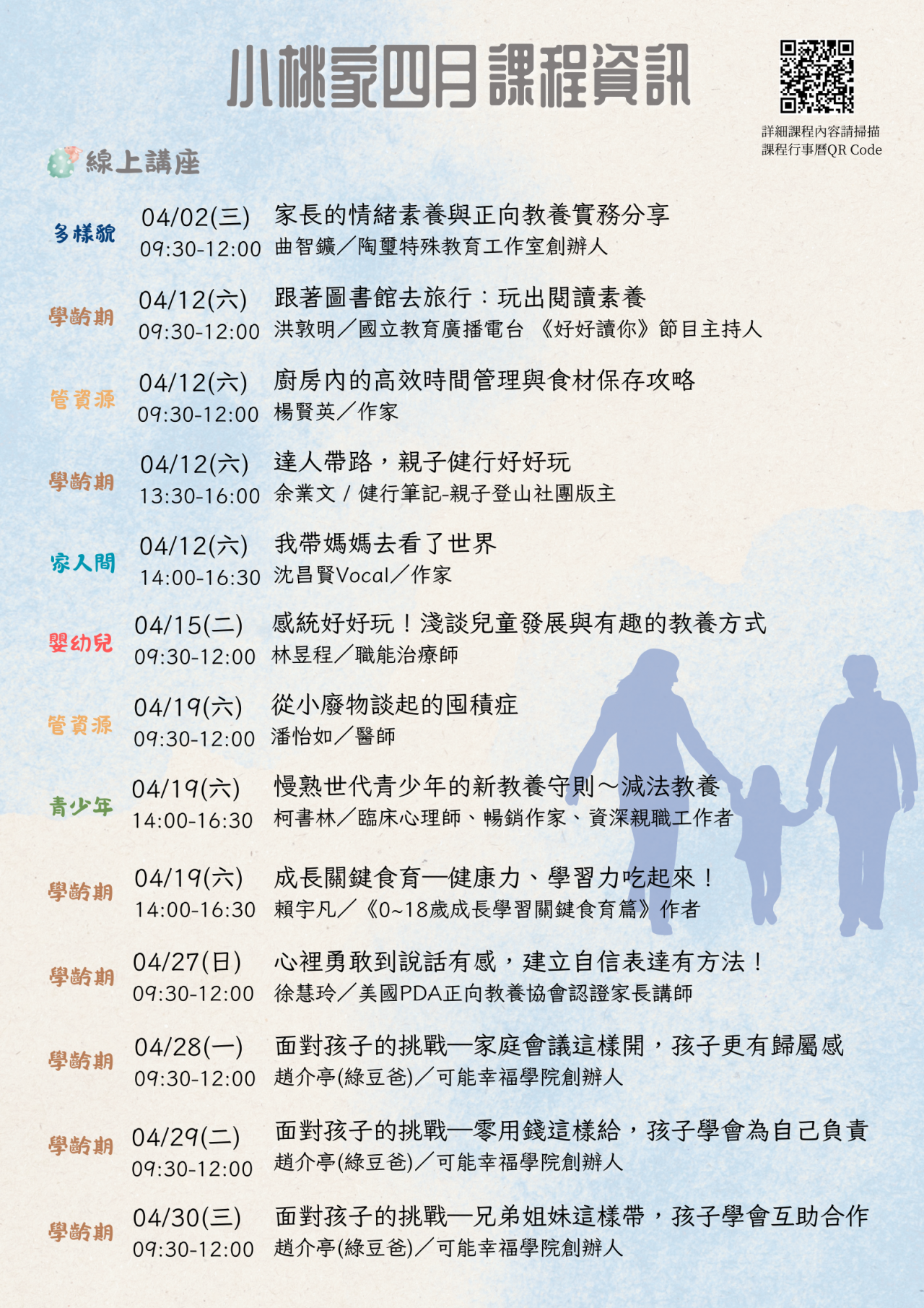 「小桃家4月課程資訊」、「用愛擁抱人生系列講座」