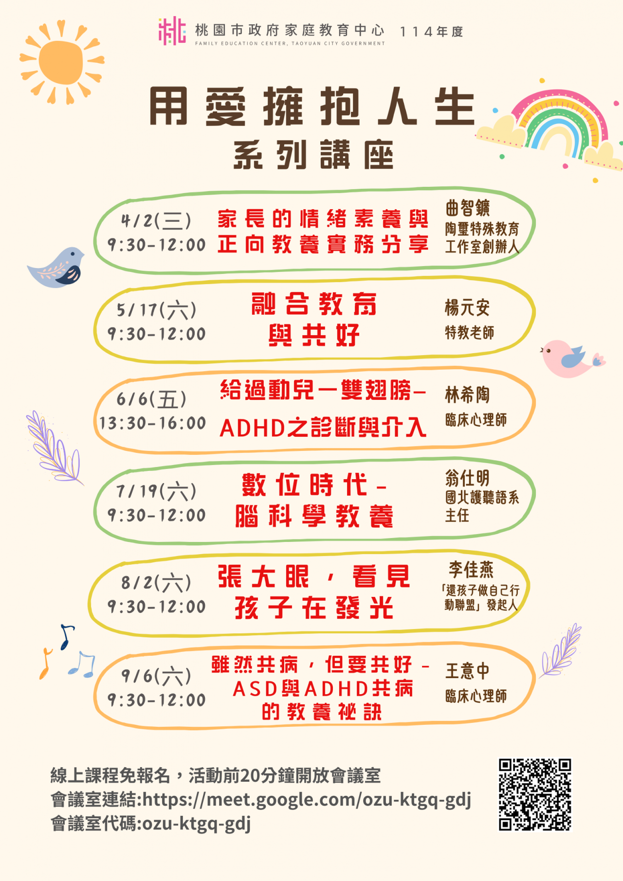 )或追蹤「桃園市政府家庭教育中心」FB 粉絲專頁;另倘有家庭教育個別化服務需求,可撥打 4128185 家庭教育諮詢專線,本市市民可申請小桃家線上諮詢室(預約連結: