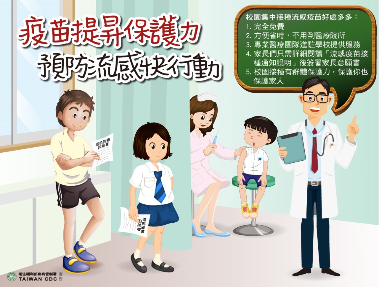 本校配合本市衛⽣局合約醫療團隊預計於114 年10 ⽉ 9⽇ 為學⽣進⾏流感疫苗接種服務, 特此通知並徵求您的同意。請您閱讀接種通知後,於意願收集截⽌期限 114 年10 ⽉ 7 ⽇ 8時00分前,請填寫並繳回,同意/不同意在校接種意願書,感謝您的⽀持與配合!